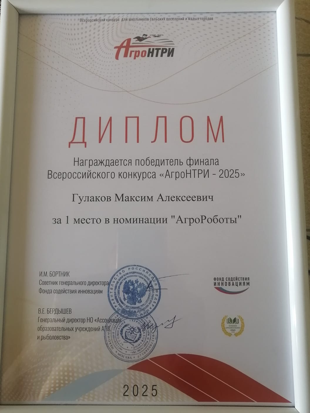 Гулаков Максим, 7 класс,1 место в конкурсе АгроНТРИ в номинации "АгроРоботы." Молодец!