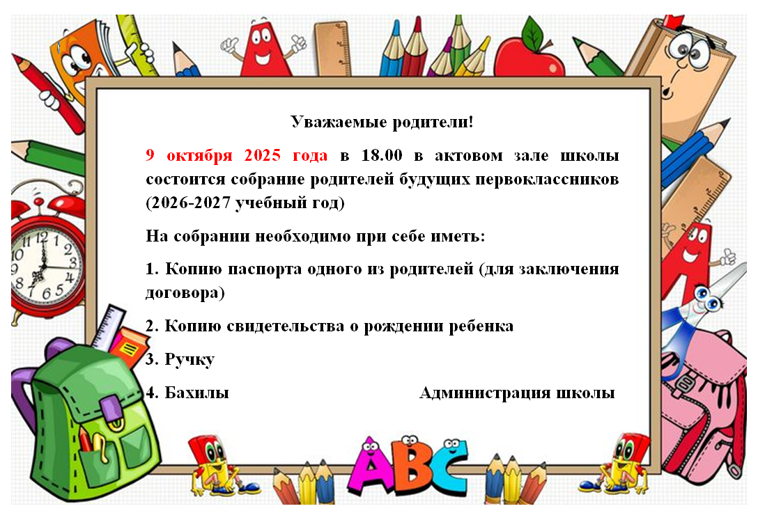 Уважаемые родители! 9 октября 2025 года в 18.00 в актовом зале школы состоится собрание родителей будущих первоклассников (2026-2027 учебный год)