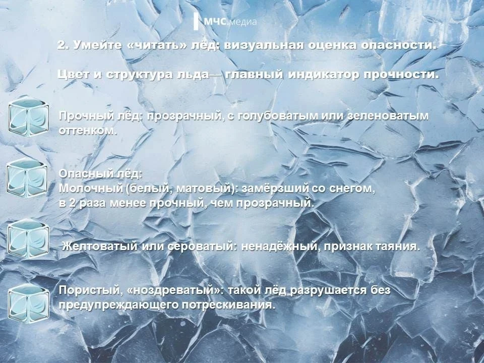 ☀️ Специалисты напоминают: при температуре около 0 °C прочность льда снижается в 10–12 раз по сравнению с показателями при −5 °C. Если же температура воздуха держится выше нуля более трёх дней, лед может потерять до 25% своей прочности.